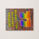 Ce dessin animé urbain et graffiti inspiré par le puzzle d'anniversaire comprend un grand nombre de "77" ayant un dégradé coloré du spectre arc-en-ciel inspiré motif. Il comporte également le message "Joyeux 77e anniversaire", et un nom personnalisé. L'arrière - plan a un motif mural en brique. Un puzzle d’anniversaire coloré et personnalisé comme celui-ci pourrait être donné pour célébrer le soixante-dix-septième anniversaire de quelqu’un. [~Z0000545]