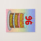 ce puzzle design joyeux et coloré à thème d'anniversaire de jigsaw représente un gâteau d'anniversaire à trois niveaux avec des bougies en forme de chiffres sur le dessus montrant le numéro "96", avec le message "HAPPY 96TH BIRTHDAY", et un nom de destinataire modifiable. L'arrière - plan a un motif multicolore pastel en arc-en-ciel inspiré du spectre dégradé. Un puzzle d’anniversaire joyeux et modifiable comme celui-ci pourrait être donné pour célébrer le quatre-vingt-seizième anniversaire de quelqu’un. [~Z0000621]