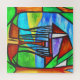 Un tableau abstrait représentant un cabine dans les arbres, près d'une rivière et de prés verts. Main peinte par fantabuloustef - 2023