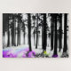 Une route étroite et sinueuse traverse une dense forêt noire et blanche, dont la surface est obscurcie par un tapis de fleurs violettes. Les arbres de part et d'autre de la route sont grands et minces, leurs branches s'élevant vers le ciel comme des doigts squelettiques. Leurs feuilles sont d'un vert profond, mais leur écorce est noire, ce qui contraste fortement avec les fleurs blanches en dessous. Les fleurs elles-mêmes sont un violet profond, riche, leurs pétales délicats et translucides. Ils fleurissent en grappes, leurs centres remplis d'un amas d'étamines. Les fleurs semblent briller dans l'obscurité de la forêt, leur couleur vive est un phare d'espoir au milieu du paysage noir et blanc.