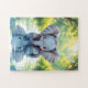 This puzzle has a cute watercolor cartoon chibi ai illustration of a baby elephant drinking out of a lake while looking at his own reflection.