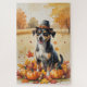 Un tableau aquarelle d'un chien gai assis au milieu d'un tas de feuilles d'automne vibrantes, entouré de minuscules citrouilles et de glands épars. Le chien porte un petit casquette pèlerin et des poutres de joie, capturant l'esprit de Thanksgiving. Dans l'arrière - plan, les champs de moissons et les arbres dorés créent une ambiance campagnarde paisible. Des textures douces et des tons d'automne chauds et feutrés confèrent à la scène une atmosphère cosy et nostalgique parfaite pour célébrer la beauté de la saison.