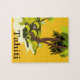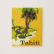 Tahiti Retro affiche de voyage avec vieux palmiers et la nature avec un arrière - plan jaune vif.