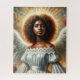 This afrocentric fantasy puzzle features classic oil painting style image of a young Black woman angel with curly hair wearing an elegant white off-the-shoulder dress, surrounded by radiant light with a halo-like effect.
