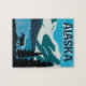 De superbes oeuvres d'art de style poster présentent des montagnes de l'Alaska avec des glaciers, de l'eau, des arbres et un orignal. Animation amusante pour toute la famille.