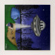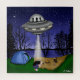 Art alien dessiné à la main. OVNI essayant d'enlever un homme campant au bord du lac dans la forêt.
