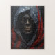 L'image représente un portrait rapproché d'une personne ressemblant à un ghoul ou à un zombie avec un visage sombre, presque squelettique, recouvert d'un réseau de lignes fines et dorées. Leurs yeux sont larges et intenses, regardant directement le spectateur. Le personnage est enveloppé dans un manteau à capuche fait d'un drapeau américain vieilli et en lambeaux, avec des rayures rouges et blanches visibles autour du cou et des épaules. L'image est une sensation post-apocalyptique ou dystopique.
