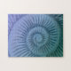 Un beau puzzle de conception naturelle avec une représentation artistique d'un fossile d'ammonite en spirale dans les violets et les verts lavande.