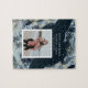 Ceci sauver la date main puzzle caractéristiques aquarelle brosse trait dans des couleurs bleu marine profonde avec des accents d'or imitant des vagues sur la plage qui en fait un choix parfait pour un été ou mariage de plage. Il est minimaliste et élégant dans la disposition et les choix de police, également très facile à customiser. Customisez avec votre propre photo ou supprimez la photo et laissez seulement le script sur le devant. D'autres objets de cette collection le complètent très bien, alors jetez un coup d'oeil à toute la collection