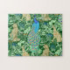 Puzzle dans un vintage Art nouveau de la tapisserie William Morris tissu représentant une scène forestière avec des paons, des lièvres et des renards, numériquement rendus en bleu cobalt, turquoise et neutres sur un arrière - plan vert foncé de forêt pour l'aspect d'une tapisserie traditionnelle