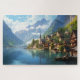 Puzzle avec le charmant lac de village dans Alps Mountains, illustration d'imaginaire.