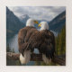 A bald eagle wraps its wing around its mate's back while they peacefully perch on a branch, overlooking a serene mountain lake framed by majestic mountains and lush forests