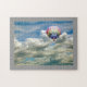 Rainbow coloré Hot Air Balloon is flying high in the fluffy white clouds in a blue sky.