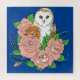 Une chouette grange avec un croissant de lune sur le front est assise parmi des fleurs roses sur un fond de bleu foncé.