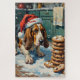 This humorous vintage lithograph features a classic tri-color Basset Hound, wearing a festive Santa hat, intently following its famous nose directly to a tempting pile of Christmas cookies. A perfect, funny holiday design for Basset Hound lovers.