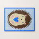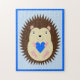 Ce puzzle merveilleux présente une image d'art numérique d'un bébé hérisson brun piquant avec des paupières brunes et un grand sourire, tenant un cœur bleu. Un excellent design pour célébrer un bébé garçon.