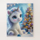 Une adorable scène de Noël avec une précieuse licorne de bébé admirant un bel arbre de Noël dans un paysage hivernal enchanteur.