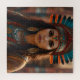 Une femme aux yeux foncés perçants regarde directement le spectateur, son visage encadré par une magnifique coiffure de plumes turquoise et orange. Elle est ornée de bijoux complexes : un bandeau perlé avec une pierre turquoise centrale, de larges boucles d'oreilles en plumes et des couches de colliers en perles, plumes et métaux. Son expression est sérieuse, son regard indéfectible, véhiculant un sens de la force et de la sagesse. L'arrière - plan est flou, suggérant un cadre naturel et mettant l'accent sur la femme comme point focal.