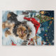 Ce design festif reflète l'esprit joyeux de la période des fêtes, avec un adorable petit portant un chapeau de Père Noël. Le chien est niché dans un pays des merveilles hivernales, avec un bonhomme de neige, un sapin de Noël décoré et des cadeaux joliment emballés. Les flocons de neige tombent doucement, ajoutant une touche magique à la scène, tandis que les couleurs vives des décorations de vacances créent une atmosphère chaleureuse et joyeuse.