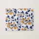 Ce puzzle bleu et orange pour filles et garçons est doté d'un motif apparemment sans fin de balles de football de tailles et de profondeurs variables, tourné partout - certaines balles de football ont des panneaux bleus et orange - personnaliser avec le nom du joueur de football et le numéro de maillot - par katz_d_zynes