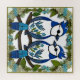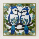 Papier coloré représentant deux geais bleus perchés sur une branche, encastrés dans un cadre décoratif. Le design présente un artisanat complexe, des teintes vibrantes et des détails harmonieux évoquant la beauté et la créativité de la nature.
