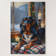 A heartwarming holiday scene featuring a dog sitting peacefully beside a window, surrounded by glowing Christmas lights. This cozy and festive design captures the spirit of the season, perfect for adding warmth and charm to any space. Ideal for dog lovers and holiday decor enthusiasts.