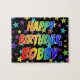 Ce puzzle dynamique, animé, sur le thème de l'anniversaire, présente le message "HAPPY BANTHDAY, BOBBY" avec des personnages ayant un motif dégradé coloré inspiré du spectre arc-en-ciel, ainsi qu'un passionnant motif arrière - plan étoiles. Un puzzle coloré comme celui-ci pourrait être utilisé pour envoyer des voeux d'anniversaire à quelqu'un nommé Bobby. [~Z0000468]