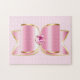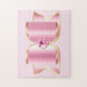 Un puzzle avec un arc brillant avec contour doré et une pierre rose facettée au centre. Style luxe féminin glam style.