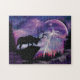 Profitez de ce Puzzle d'Elk Bull "One of a Kind" unique ! Il présente une silhouette noire d'un élan taureau debout sur une haute montagne surplombant une magnifique lune dans une tempête violette! ! Art graphique original par l'artiste Kerry Miller.