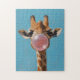Un tableau fantasque d'une girafe soufflant une bulle de gomme rose.