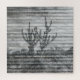 This cozy and moody looking gray color tone scheme photograph features semi transparent images with two overlapping versions of horizontal wooden lumber floor like planks along with some groovy grains layered together plus an image of two large and several smaller southwestern desert landscape Columnar style cactus plants growing in a field of wild sagebrush bushes.