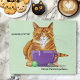 Un mignon chat tabby orange assis devant une tasse de café violet dans un arrière - plan de vert
