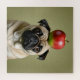 Carlin drôle avec une pomme équilibrant sur le dessus de sa tête.