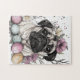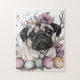 Puzzle floral carlin de Pâques. Aquarelles rustiques et carlin de couleur pastel de style lineart avec oeufs de Pâques et botaniques floraux.