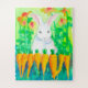 Un puzzle amusant pour les enfants pour le printemps et Pâques avec un joli lapin blanc dans un jardin de carottes et de fleurs roses peintes dans des tons clairs d'aquarelle.