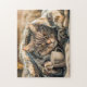 Puzzle Cat with coffee and book in cozy blanket