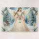 A serene celestial angel stands beneath a snowy archway of evergreens and winter florals, gently cradling a glowing lantern that spills soft golden light across her gown. Behind her, a dusky blue forest of snow-covered trees shimmers with falling flakes and tiny sparks of light, creating a peaceful, storybook atmosphere. Delicate lace details, flowing sleeves, and a halo-like crown of foliage give this winter angel illustration an ethereal, cottagecore charm that feels both nostalgic and on-trend. Soft blue and warm cream tones blend into a dreamy palette that suits spiritual holiday imagery, quiet reflection, and year-round messages of hope. This design is ideal anywhere a touch of calm, light, and heavenly beauty is desired. AI generated artwork.