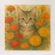 Une aquarelle saisissante illustrant un chat curieux parmi les fleurs d'automne; marigolds et chrysanthèmes.