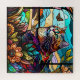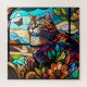 Ce magnifique décor en vitrail est composé d'un chat assis au milieu des fleurs, observant un papillon.