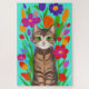 Joli style d'art populaire mignon chat gris aux yeux verts. Cet art est généré par l'IA. Jolies fleurs bleues, violettes et rouges avec un arrière - plan turquoise.