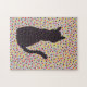 Chat noir (ou une silhouette de félin coloré). Points éparpillés en rouge, jaune et noir sur arrière - plan gris. Art par Deanna Pendrick