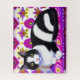Puzzle dans une illustration d'un chat tuxedo noir et blanc sur un coussin, avec un arrière - plan exotique à motifs dans les tons magenta et violet