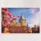 Ce puzzle a une belle photo d'un château avec des fleurs dessus.