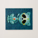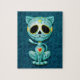Cette conception bleue adorable de chaton est décorée des remous et des motifs de point sensibles. La fleur jaune pédale cercle les yeux au beurre noir purs dans la tradition du jour des crânes morts de sucre. Le chat s'assied, regardant en avant avec sa queue ondulant à l'arrière-plan. La tête surdimensionnée se repose sur un corps minuscule qui crée un espiègle, bande dessinée comme l'aspect. Une étoile de cinq points se repose au milieu du front du chaton tandis qu'un coeur rouge et jaune lumineux apparaît au centre du coffre. Une ombre tombe sur l'arrière - plan bleu profond faisant la conception semblent flotter juste au-dessus de la surface de ce puzzle. Le petit chat mignon est un amusement et une conception élégante inspirés par les beaux motifs du jour des crânes morts de sucre.