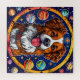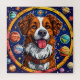 Chien joyeux à la fourrure brune et blanche, placé en évidence contre un arrière - plan vibrant de l'espace. Le chien est centré dans un cadre circulaire décoré de planètes colorées, d'étoiles et d'autres éléments célestes. Sa langue est sortie, et elle a une expression heureuse, lui donnant une personnalité ludique. La combinaison du chien et du thème cosmique crée une atmosphère fantaisiste et imaginative. Les couleurs sont vives et audacieuses, ce qui renforce l'ambiance joyeuse de l'illustration.