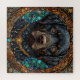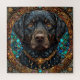 Portrait très détaillé et stylisé d'un chien du labrador noir. L'expression du chien est frappante, avec des yeux profonds et pleins d'âme qui transmettent intelligence et chaleur. Autour du chien est une frontière décorative complexe qui combine des éléments comme des pierres précieuses et des motifs ornés, créant une atmosphère mystique et royale. L'utilisation de couleurs riches, notamment le blues et les dorures, renforce l'aspect artistique, donnant à l'image entière une qualité imaginaire. Le collier du chien semble embelli, ajoutant à l'élégance générale de la pièce.