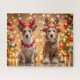 Deux grands chiens habillés en rennes posent près d'un sapin de Noël. L'arrière - plan a un effet bokeh.