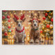 Deux grands chiens habillés en rennes posent près d'un sapin de Noël. L'arrière - plan a un effet bokeh.