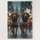 Ce design festif capture l'esprit joyeux de la saison des fêtes, mettant en vedette des chiens adorables. Nichés dans un pays des merveilles hivernal, avec un arbre de Noël décoré et des cadeaux magnifiquement emballés. Les flocons de neige tombent doucement, ajoutant une touche magique à la scène, tandis que les couleurs vives des décorations de Noël créent une atmosphère chaleureuse et joyeuse.