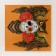 Ce design audacieux de hibou à tête de crâne en sucre fusionne le symbolisme du Día de los Muertos avec un style gothique saisissant. Un hibou brun détaillé aux ailes déployées encadre un crâne en sucre décoratif orné d'accents floraux colorés, d'un motif diamant et de roses rouges vibrantes. Placée sur un fond orange riche, cette œuvre d'art capture un mélange dramatique de sagesse, de mystère et de beauté gothique romantique.